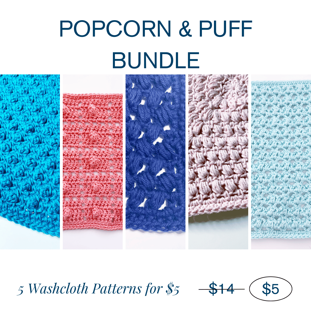 5 Washcloths discounted in a bundle that will allow you to practice both the popcorn and puff stitches in a variety of different designs.